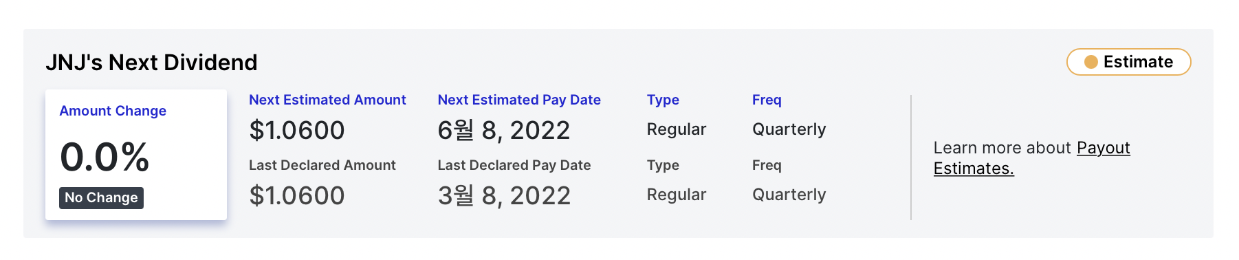 JNJ는 작년 1쿼터에 $1.01를, 2~4쿼터에 $1.06을 배당했다. 그리고 올해 1쿼터에는 이미 $1.06을 배당했다.