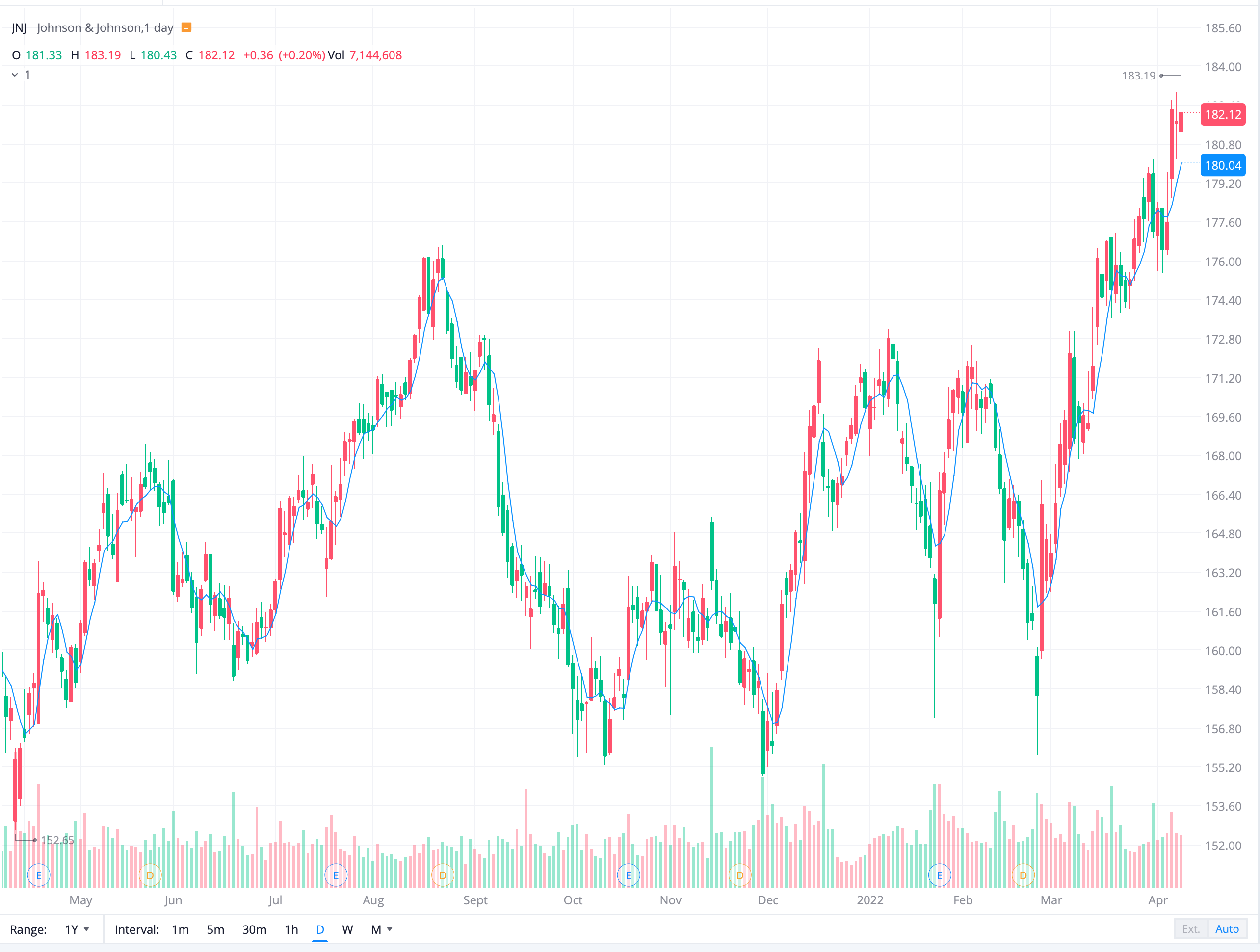 최근 1년 간 JNJ의 주가는 등락을 거듭했다. 그런데 올 3월에 1년 고점을 갱신하며 상승세를 보이고 있다.