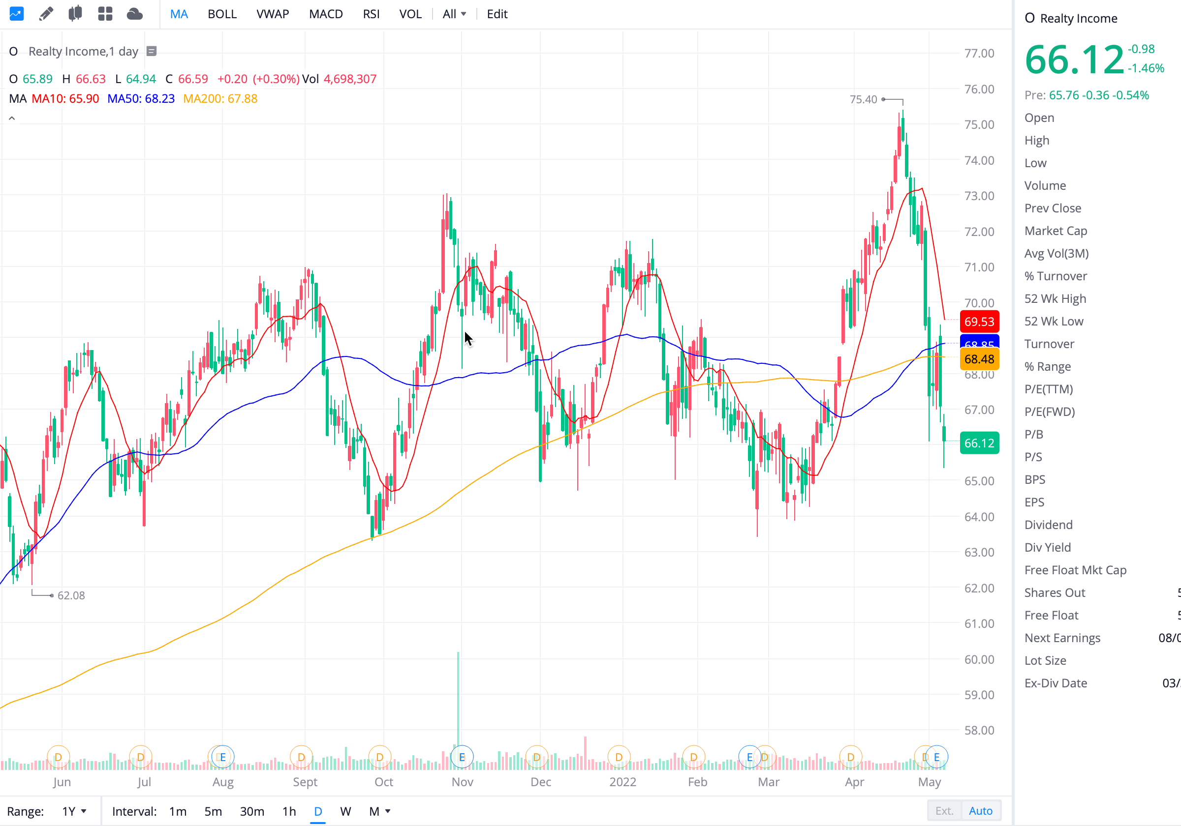 최근 1년 간 리얼티 인컴의 주가 차트이다. 지난 2주 미국 주식 시장이 워낙 좋지 않았었기 때문지 급한 하락을 보였다. 마지막 종가는 52주 최고점에 비해 -12.31% 하락한 가격이다.