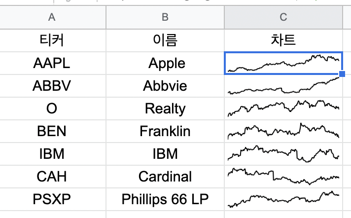 그런데 찾다보니 기쁘게도 구글 파이낸스는 차트를 지원한다는 것을 알게 됐다. 우리가 생각하는 캔들 차트를 셀에 구현하기는 어렵지만, 장기간의 추세를 파악하는 데는 큰 무리가 없을 정도의 차트를 그려볼 수 있다.
