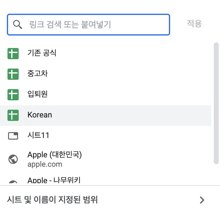 그러면 위와 같은 메뉴가 뜬다. 지금 우리는 애플에 대한 링크를 만들고 있다. 애플의 티커는 AAPL이니 빈 칸에 "https://finviz.com/quote.ashx?t=AAPL"를 넣고 "적용"을 누른다. 다른 종목이라면 마지막에 있는 = 이후에 해당 종목의 티커를 넣으면 된다.