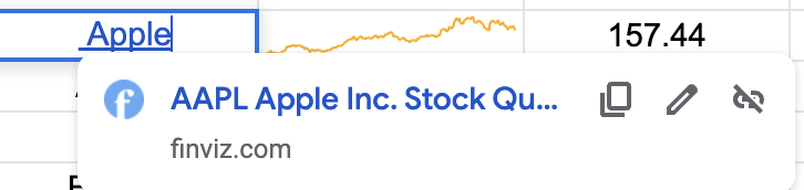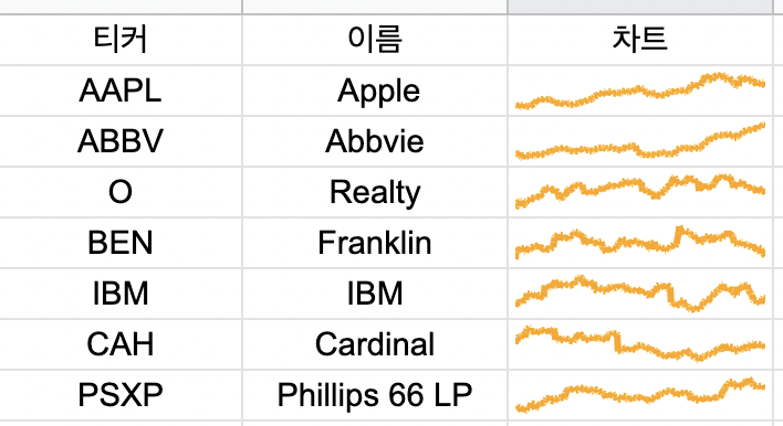 처음 스프레드 시트에 포트폴리오를 정리할 때 가장 아쉬운 점이 차트를 보려면 종목마다 일일히 링크를 만들고, 두 번 더 클릭을 한 뒤 핀비즈로 들어가야 한다는 점이었다.