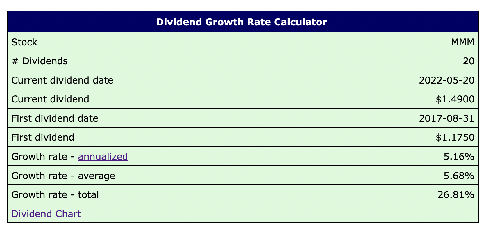 예를 들어 3M은 최근 5년 간 배당을 연간 5.13% 늘려왔다는 것입니다. 그러나 실제로 각 종목의 항목으로 들어가 보면 약간 다른 결과가 나와있습니다.