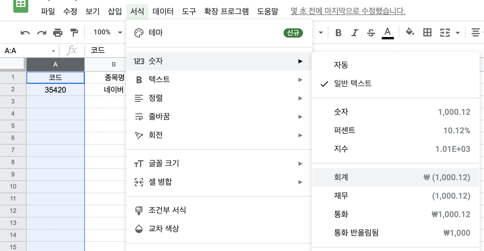 위의 이미지처럼 코드가 들어가는 열 전체를 선택하고 "서식-숫자-일반텍스트"를 클릭하여 셀의 속성을 텍스트로 바꾼다. 그러고 나서 네이버의 코드인 035420을 넣어보자.