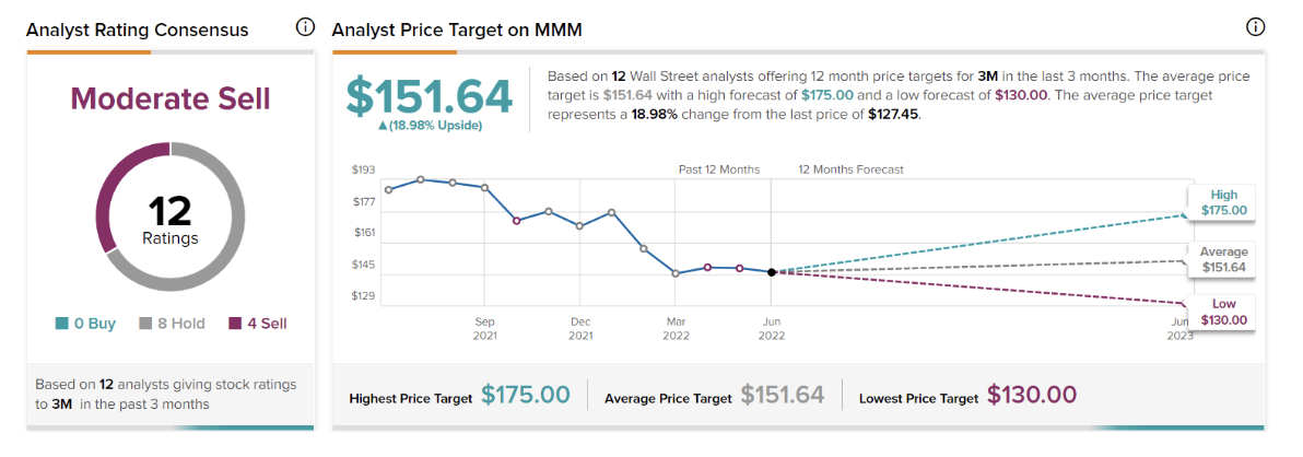 월스트릿 전반은 3M에 대해 3개의 중립과 4개의 매도 의견을 내고 있으며, 종합적인 등급은 Moderate Sell 입니다. 평균 목표가는 $151.64로 현재보다 19%가량 높은 수준입니다.