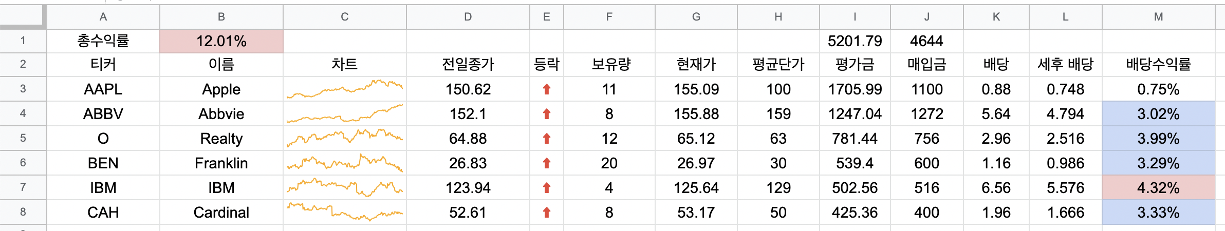위와 같이 M1 셀에 나의 총배당수익률이 표시된 것을 볼 수 있다.