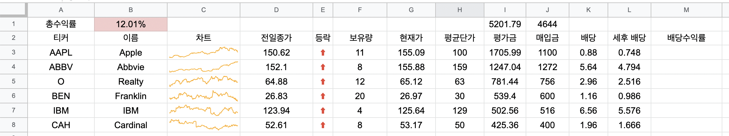 K열의 배당은 핀비즈에서 실시간으로 불러온 값이다. 방법은 관련 포스팅을 참고하기 바란다.