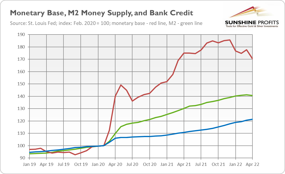또한 두 달 사이에 본원통화(monetary base)를 40%나 증가시켰습니다. 이번 재정정책이 과거와 다른 점은 이번에는 연준이 유동성을 메인 스트릿 프로그램(Main Street Program)을 통해 유동성을 공급했다는 것입니다. 결과적으로 코로나 발발 이후 2년 간 M2가 40%가량 증가했으며, 은행 신용 - 즉 대출 - 은 20%가량 증가했습니다. 아래 차트와 같이 말입니다.