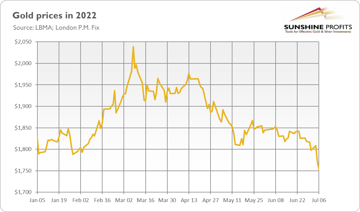 위의 차트에 보시다시피, 지난 6월에 금의 가격은 떨어졌습니다. 5월 31일의 $1839에서 6월 30일에는 $1817로 1.2% 하락했습니다.