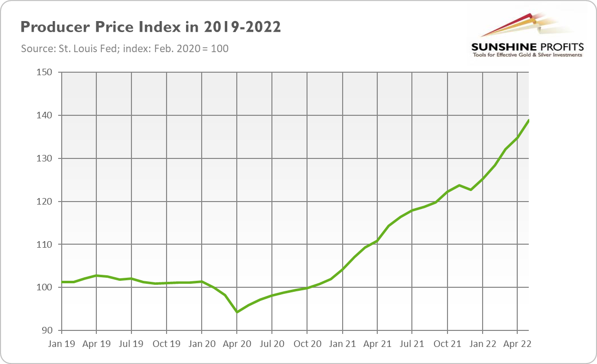 새롭게 공급된 유동성은 기업으로 흘러들어 갔고 기업들은 새로운 투자를 시작했습니다. 하지만 인풋은 늘어나지 않은 상태였기 때문에 생산자 가격이 치솟았습니다. 아래 차트를 보시면 거의 40%가 증가했음을 알 수 있습니다. 그러자 기업들은 더 많은 대출을 받아야만 했고, 단기 채권의 수익률이 증가하며 채권 수익률 곡선의 역전이 발생했습니다. 장단기 금리 역전, 채권 수익률 곡선 역전에 대해서는 아래 링크를 참고하시면 도움이 될 것입니다.