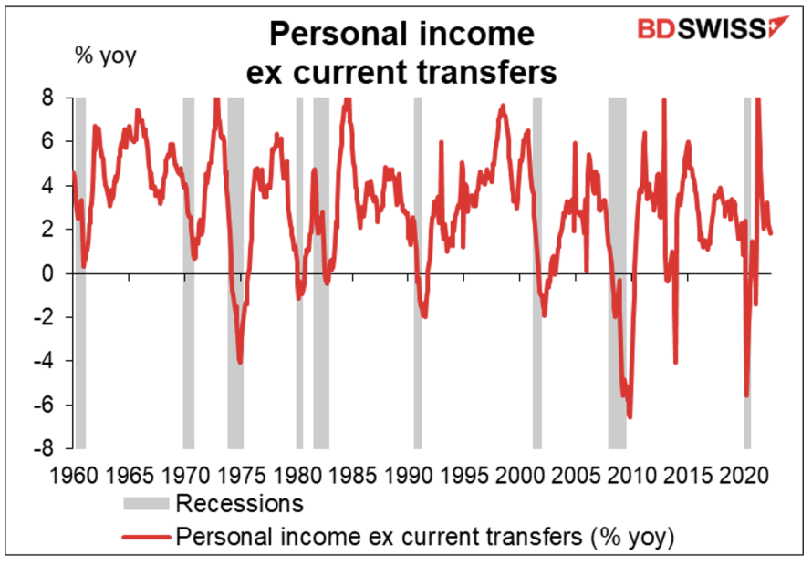 Personal income excluding current transfers은 전년 동기 대비 1.8% 상승했습니다. 경기침체의 징후는 없습니다.