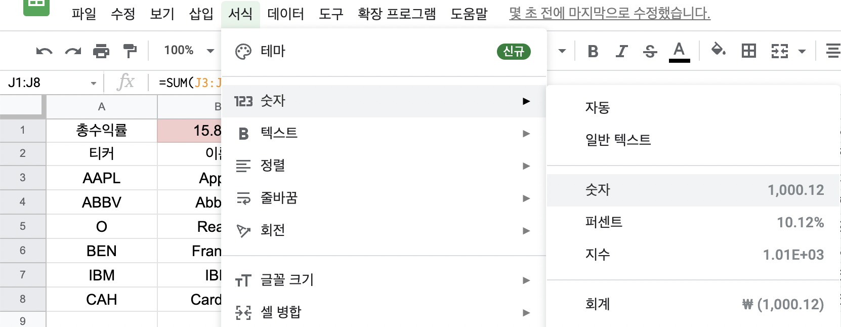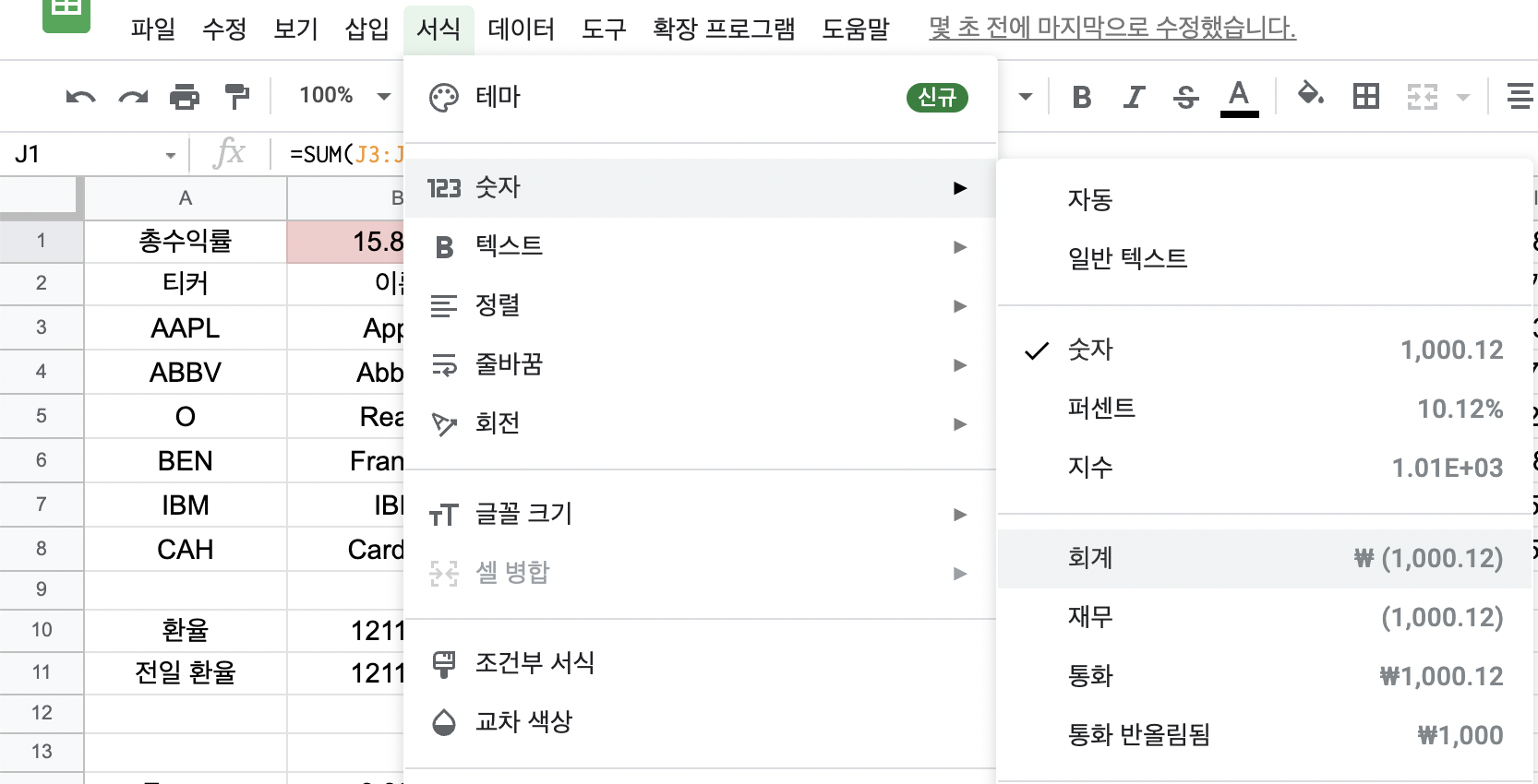 J1 셀과 L1 셀은 원화로 바꾼 각 종목의 평가금과 매입금의 총합을 넣은 셀이다.