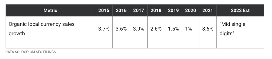 3M의 CEO Inge Thulin은 2016년에서 2020년 사이에 헬스케어 비즈니스 부문 판매를 4%에서 6% 성장시킬 것이라고 이야기했었습니다. 하지만 실제 성적은 이에 미치지 못했습니다. 2021년에 실적이 매우 좋았던 것은 락다운에서 해제되며 보복적 소비가 일어났기 때문일 것으로 보입니다.