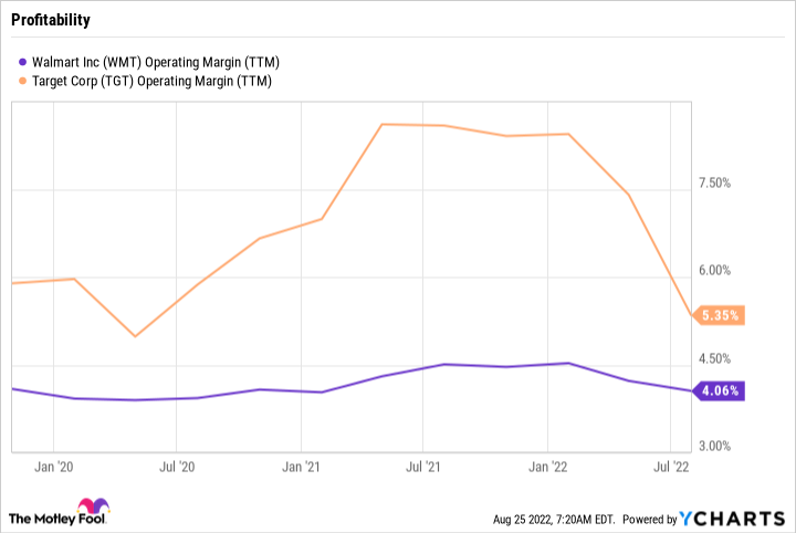 최근 좋지 않은 상황을 헤쳐 나가는 능력은 월마트가 타깃보다 나은 것 같습니다. 그래서 투자자들 역시 월마트가 조금 더 안전하다고 보는 것 같습니다. 반면 타깃은 영업이익률이 과거 10%에서 많이 내려왔습니다. 안정성을 원한다면 월마트가 나은 선택일 것입니다. 아래 그래프를 보시면 월마트의 영업마진은 타깃보다 낮지만 꾸준히 유지되고 있음을 알 수 있습니다. 반면 타깃은 변동폭이 매우 큽니다.