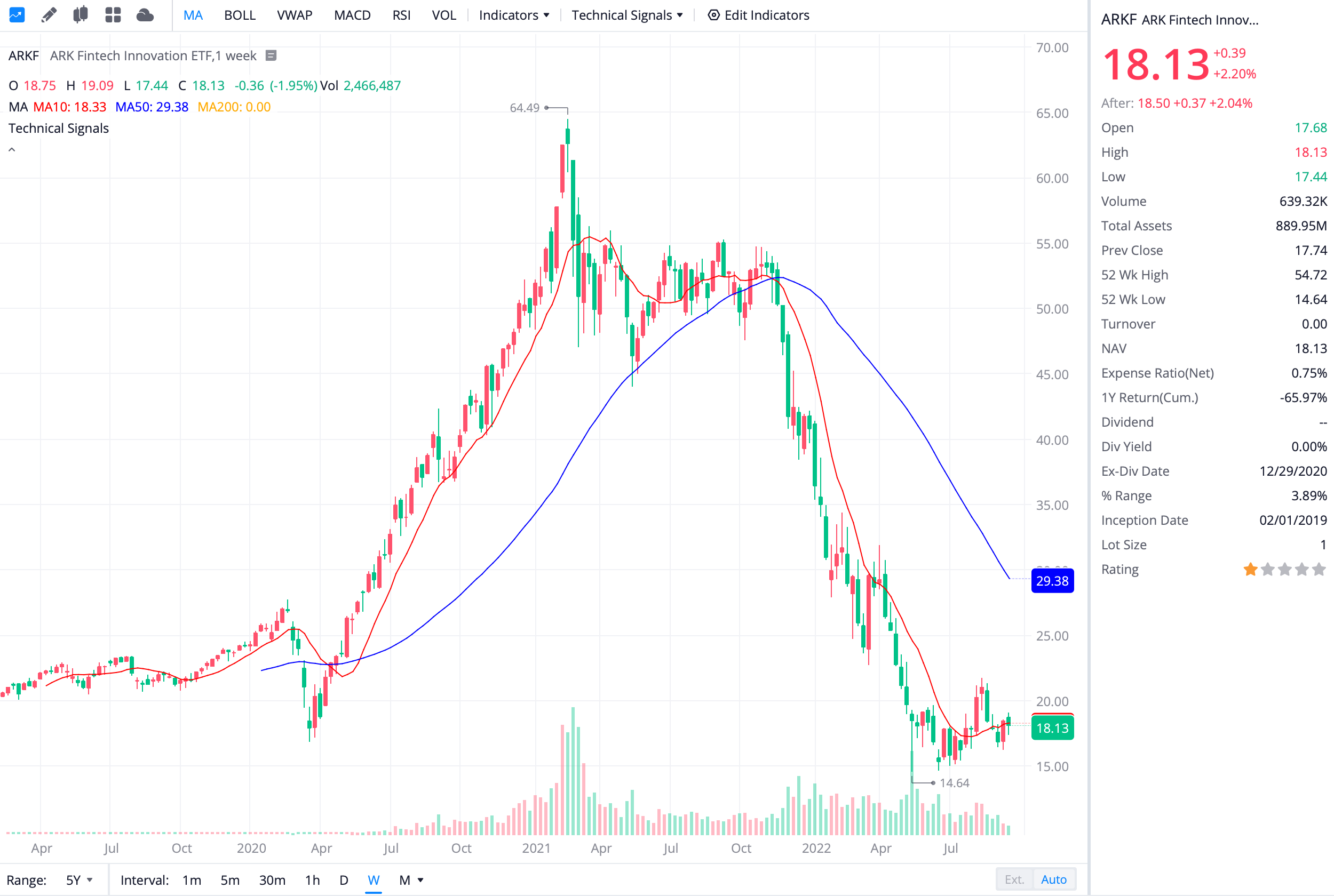 위에 보시다시피 ARKF 역시 고점에서 69%나 하락했습니다. 현재와 같은 고금리 상황에서는 적절히 수익을 내지 못하는 핀테크 기업이 설 자리는 없습니다. 당연히 이런 핀테크 기업들을 한 바스켓에 담아둔 ARKF 역시 좋을 리가 없겠죠.