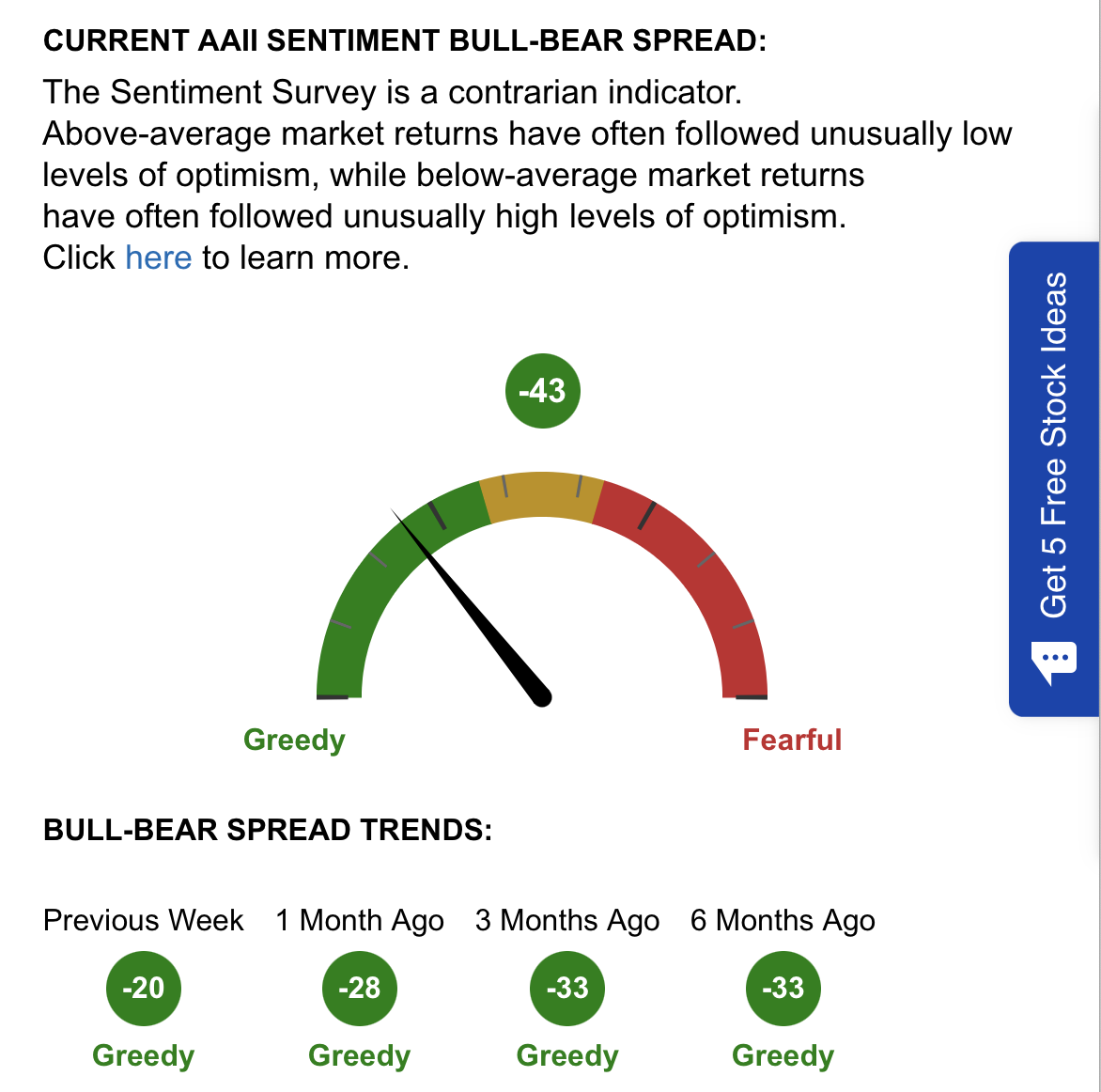 그리고 아래 이미지처럼 AAII 중 Bull(상승론자)과 Bear(하락론자)의 비율의 차이가 1987년 이후 최저치를 찍었습니다. Bull-Bear Spread는 상승론자의 비율에서 하락론자의 비을 뺀 것입니다. 현재 상태에서는 60.9-17.7이 될 것이며 그 값은 43.2입니다. 그리고 이것이 매우 낮은 수치라는 것입니다.