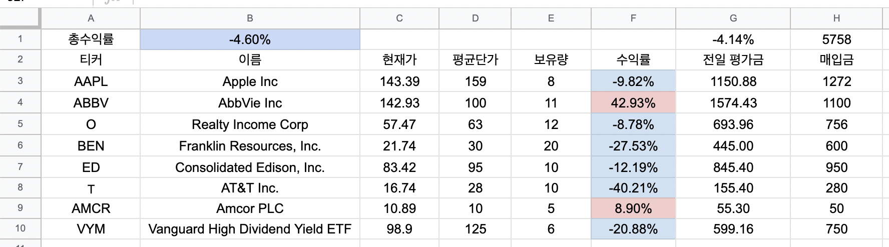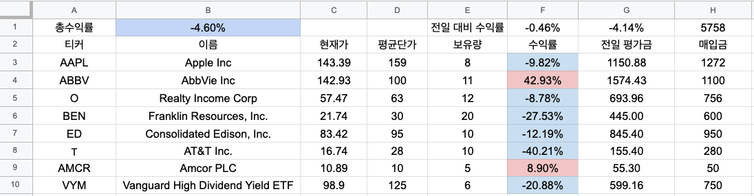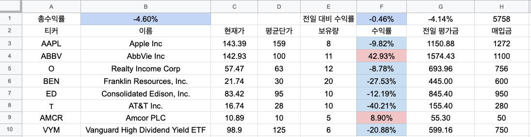 2022.03.15 - 구글 스프레드시트 주식 배당 관리 - 11. 총수익률 표시하고 색깔 넣기