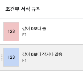 그리고 F1 셀에 다음과 같은 조건부 서식을 적용합니다.