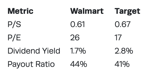 월마트가 매출 대비 가격이 더 낮습니다. 반면 PER과 배당수익률, 배당성향은 더 높습니다.