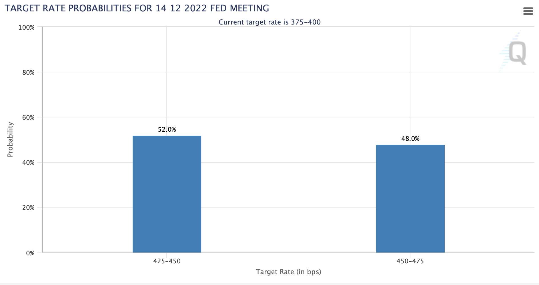 위의 이미지는 12월 FOMC에서 얼마의 금리 인상이 있을지에 대한 시장의 전망입니다. 50bp 인상과 75bp 인상 확률이 거의 반반입니다.