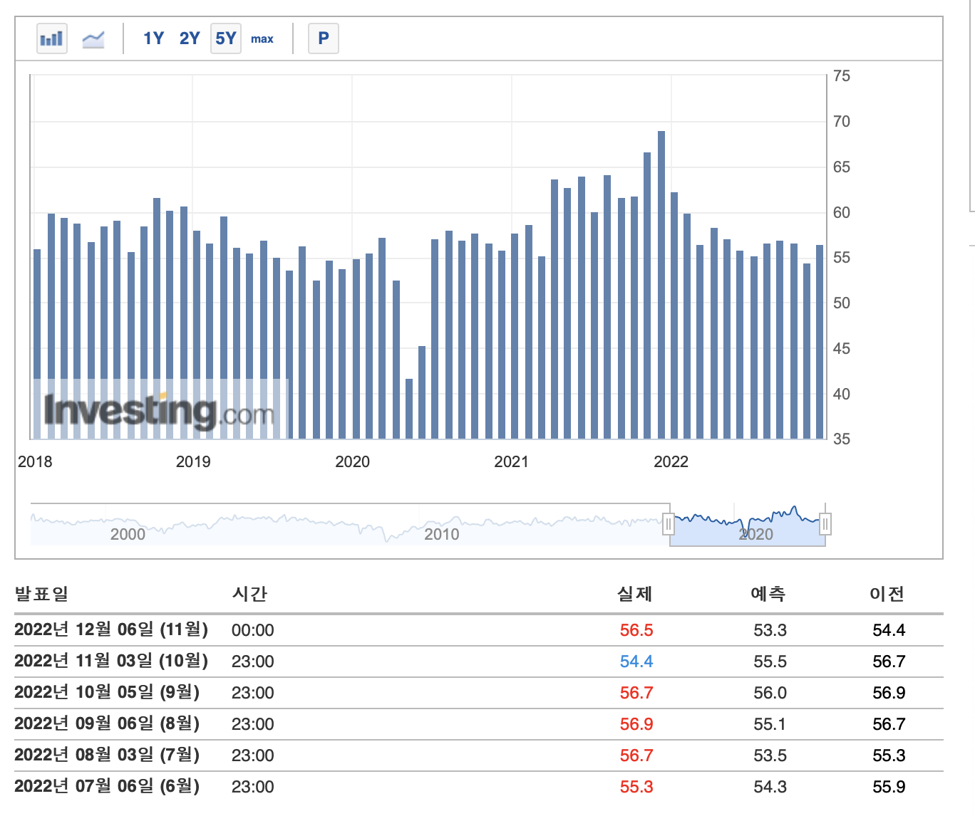 당초 예상치는 53.3이었는데 이보다 높은 56.5가 나왔고, 이는 미국의 인플레이션이 예상만큼 빠르게 식어가지 않고 있다는 해석을 가능하게 합니다.
