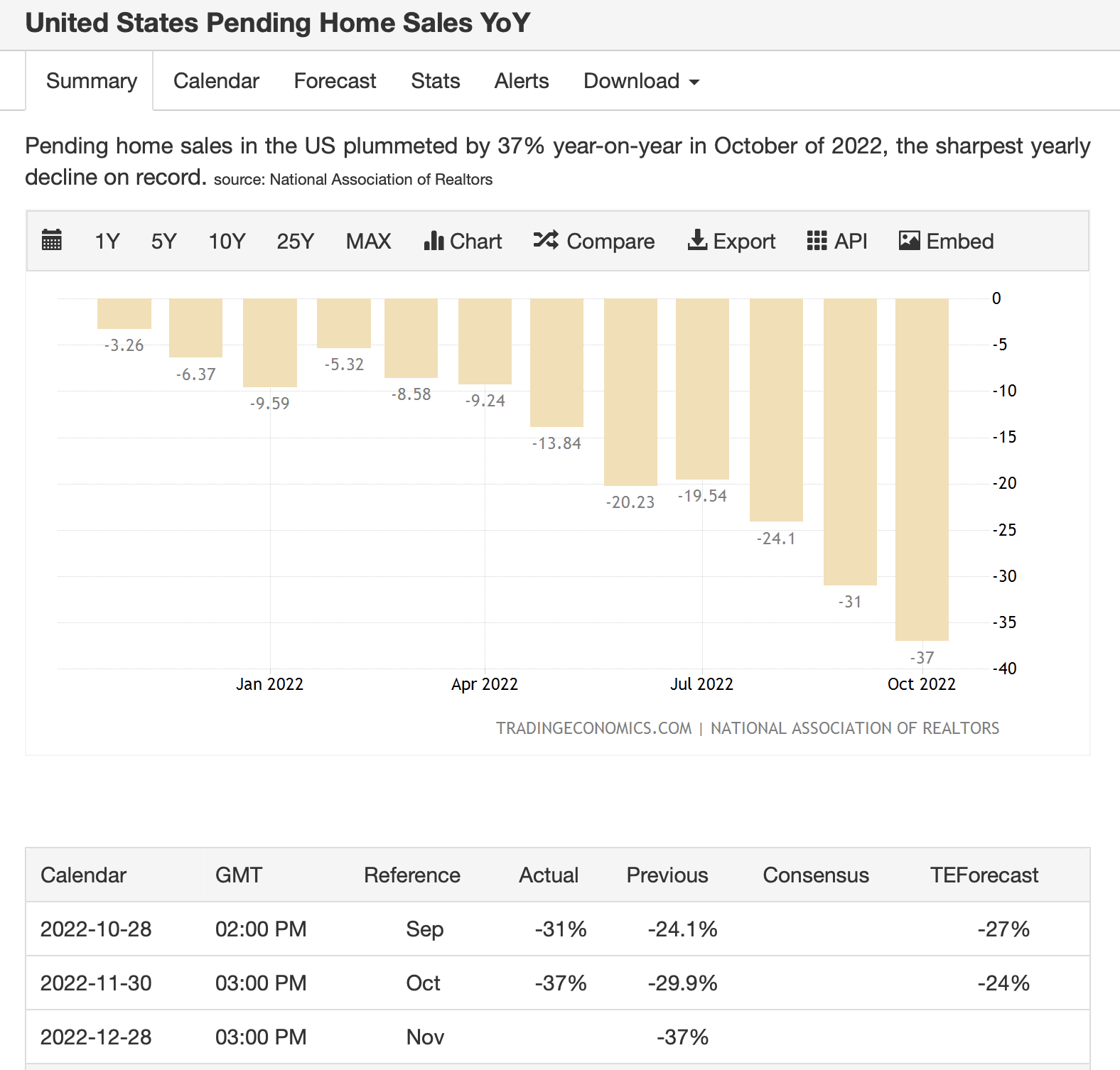 Pending Homes Sales는 주택의 계약량을 추적하는 수치입니다. 그런데 위의 그래프처럼 11월 30일에 발표된 마지막 데이터 상으로는 전년 대비하여 37%나 감소했습니다. 금리 인상으로 인해 이자 조달 비용이 증가하니 주택 담보 대출을 받는 사람의 숫자가 줄어들고 새로 집을 사는 사람의 숫자도 급감하는 것일 것입니다. 우리나라 부동산 시장도 거래 절벽이 발생하고 있으니 미국과 같은 상황이라고 하겠습니다.