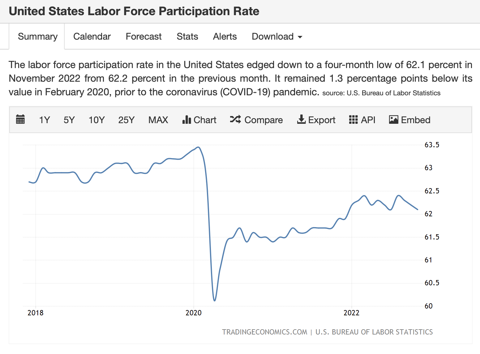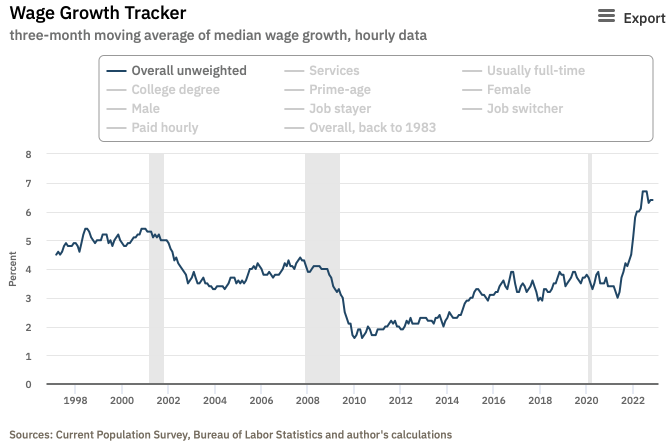 위의 이미지를 보면 2020년 이후 미국 임금의 중간값이 얼마나 증가했는지 볼 수 있습니다. 경제 활동 참가 인구수가 급감한 것과 동일한 모양으로 위로 치솟고 있습니다.