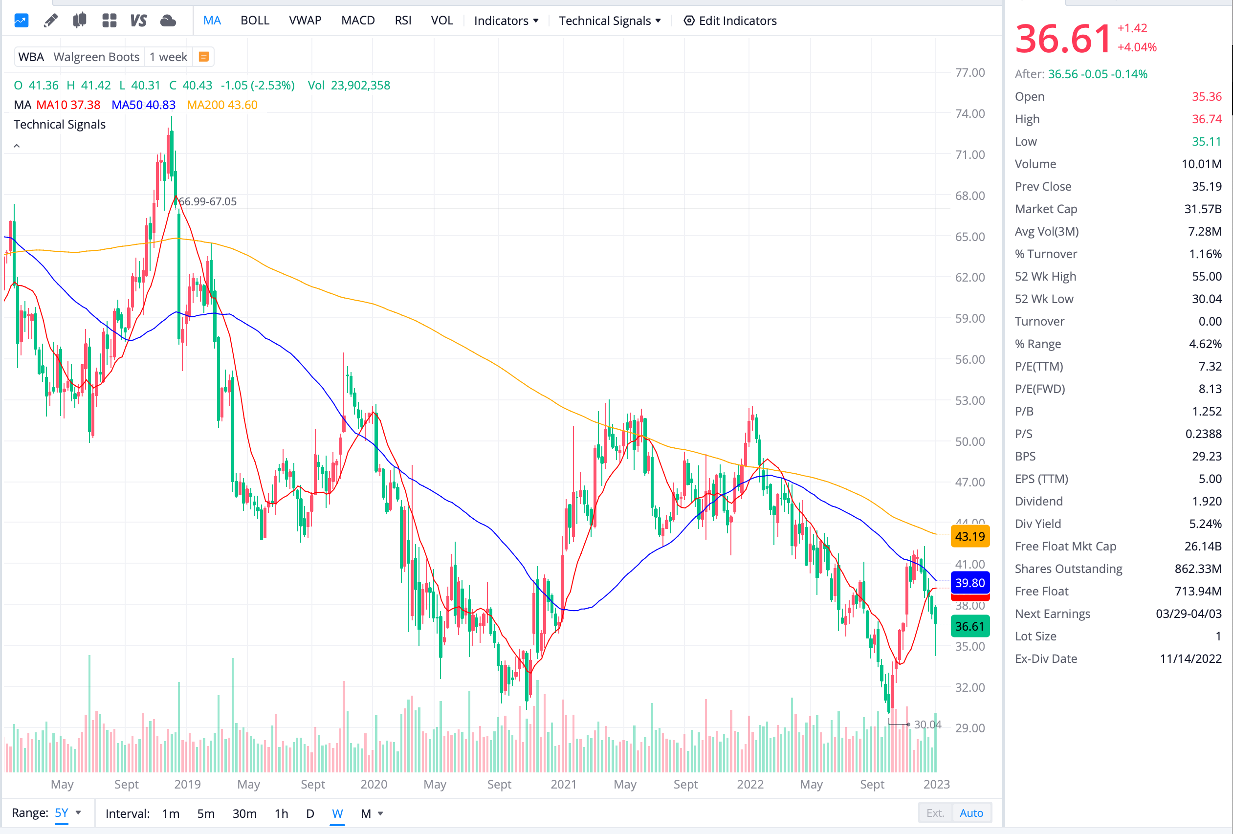 2022.08.15 - 월그린 부츠 얼라이언스 Walgreen Boots Alliance (WBA) | 고배당주 | 오피오이드 소송 | 전망 악화