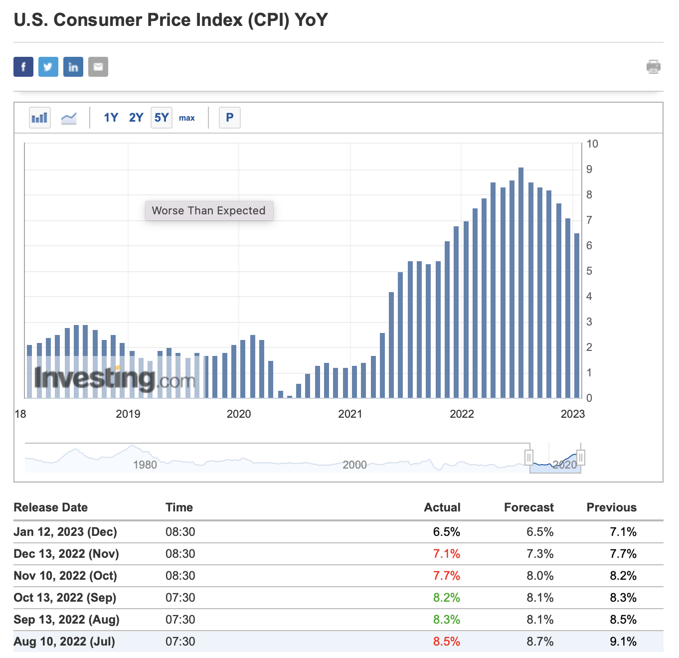 어제 발표된 작년 12월의 CPI가 전년 12월 대비 6.5% 상승한 것으로 집계되었습니다. 시장의 예상치 역시 6.5%였습니다. 이제 확실히 인플레이션이 식어간다는 증거로 볼 수 있겠습니다.