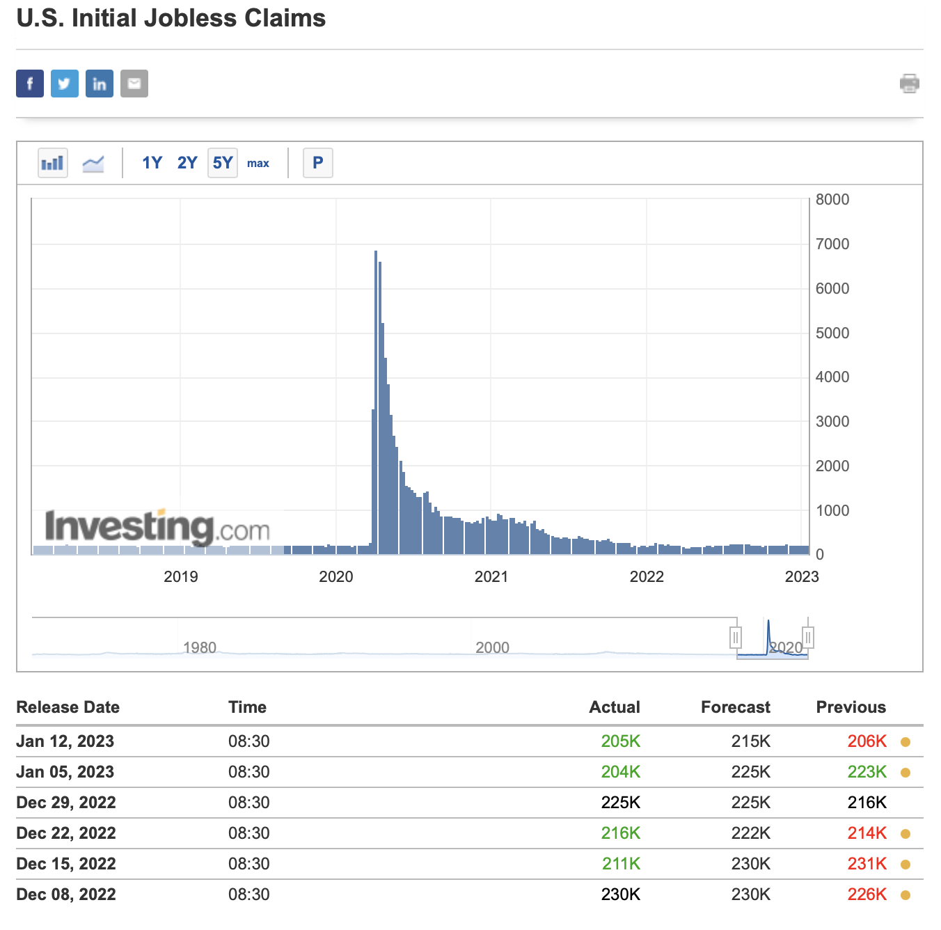 그리고 실업 수당 신청 건수도 예상치인 215,000건에 미치지 못하는 205,000건이었습니다. 실업 수당 신청 건수가 적어진다는 것은 실업자가 적다는 것을 의미합니다. 즉 일을 하는 사람들이 많다는 것이지요.