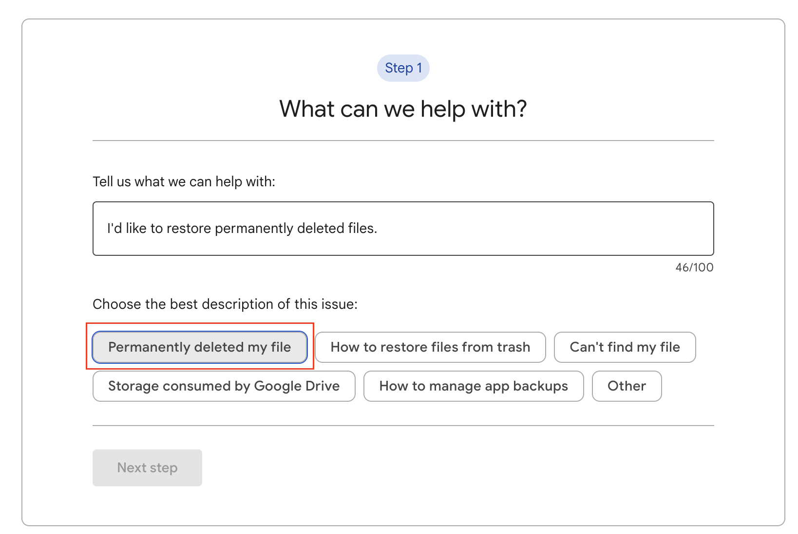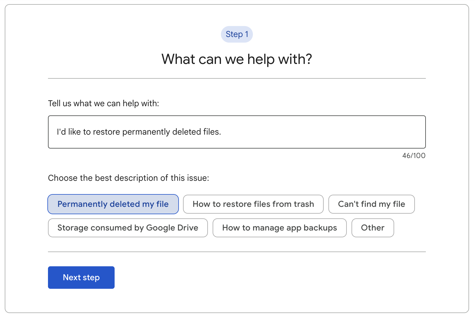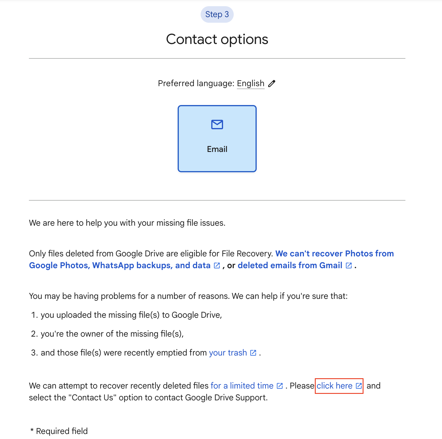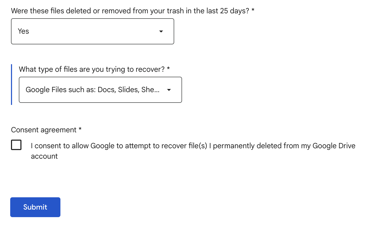 25일 이내에 휴지통에서 삭제된 파일이 맞느냐는 질문에 No라고 하면 아예 진행이 되지 않습니다. Yes로 답변을 하고 어떤 타입의 파일을 복구할 거냐는 질문이 나와서 그냥 "Google Files"를 선택하고 아래 네모에 체크한 뒤 "Submit" 버튼을 누릅니다.