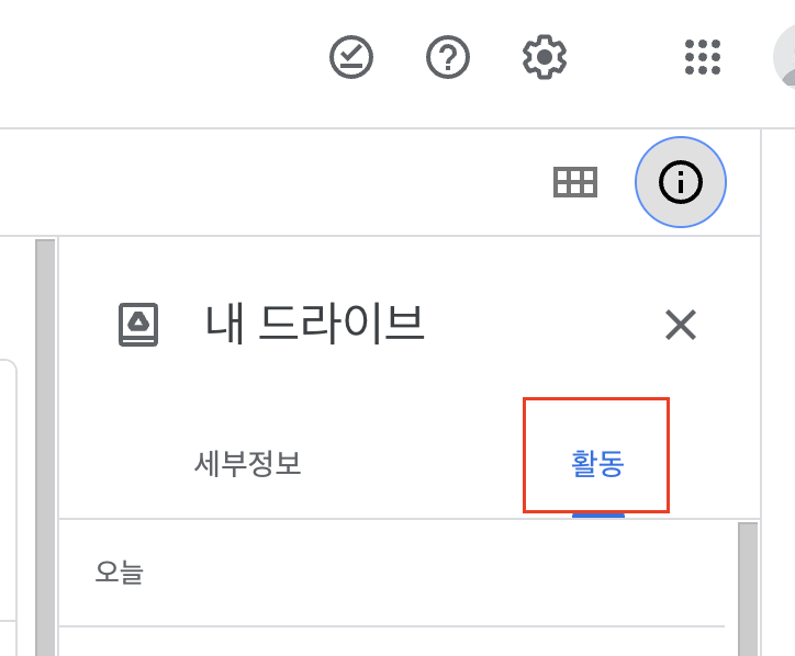 구글 드라이브에서 아래 이미지의 ⓘ 버튼을 누른 뒤 "활동" 탭을 클릭하면 드라이브에서 어떤 활동이 이루어졌는지에 대한 이력을 볼 수 있습니다. 그런데 사실 이력에서도 그 폴더가 지워진 이력을 찾을 수가 없었습니다. 그 폴더가 왜 지워졌는지 알 수가 없는 상황이었습니다.