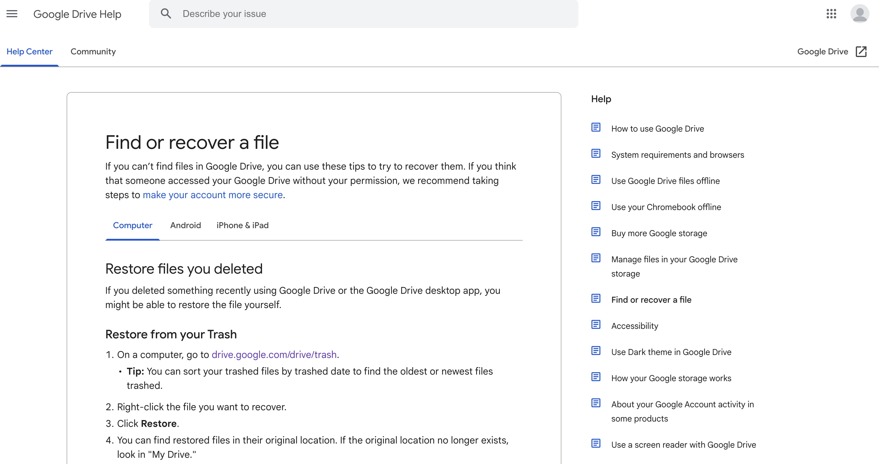 위의 링크를 클릭하시면 구글 드라이브 고객센터로 들어갈 수 있습니다.