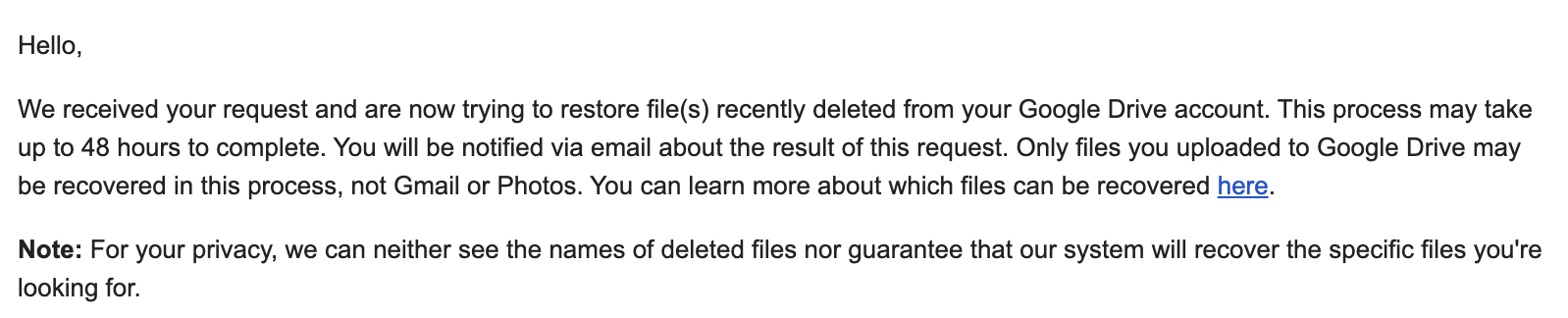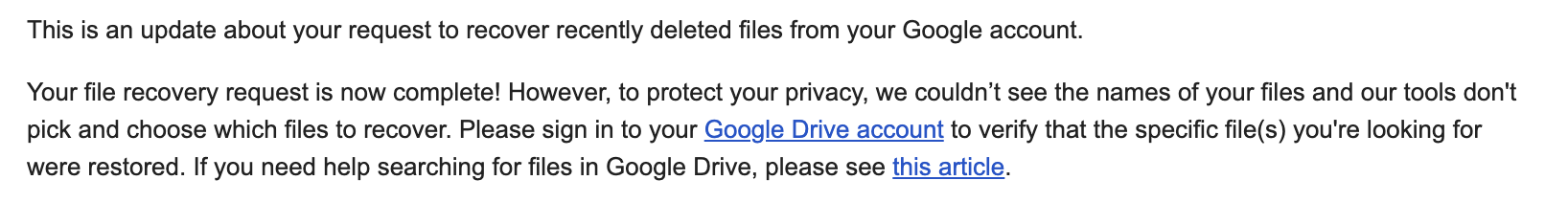 그리고 나면 아래와 같은 이메일이 옵니다. 파일 복원 요청이 접수되었고, 복원에 48시간까지 걸릴 수 있다는 내용입니다.
